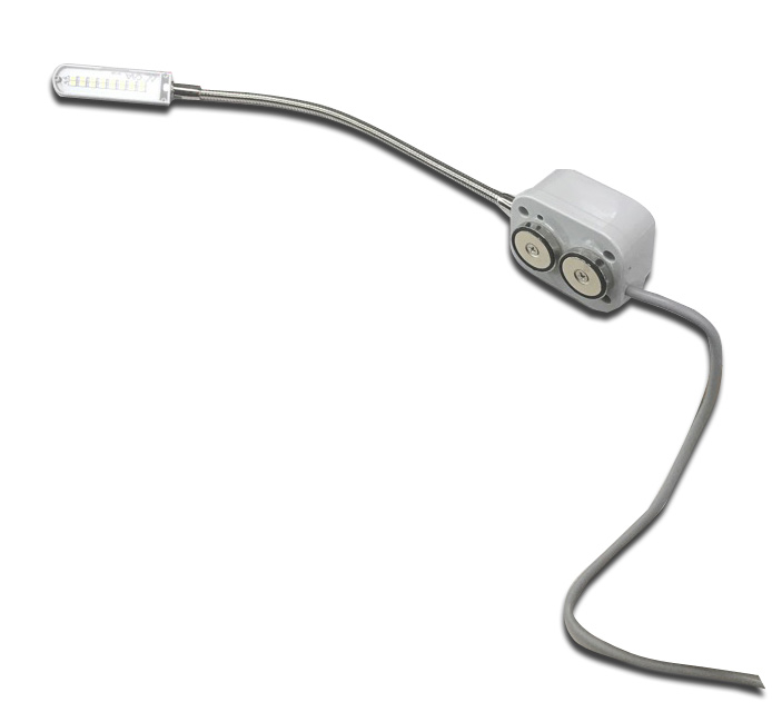 | 100V電源で配線してミシン上部に本体を強力マグネットで固定するLEDライト。 手軽で球切れの心配も無く、明るさも十分だが明かり感に好みが分かれるかも。 |